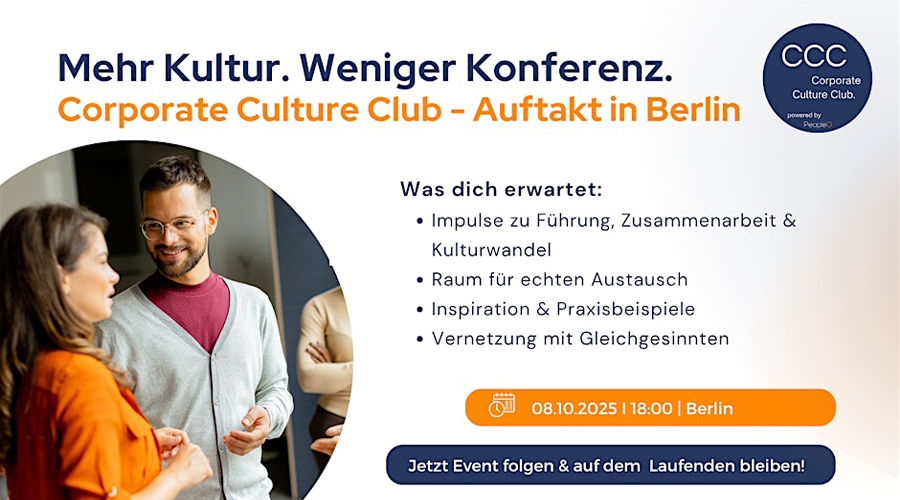 Der Corporate Culture Club (CCC) findet zum ersten Mal statt und lädt zu einem Abend ein, der Unternehmenskultur erlebbar macht – am Vorabend vom PEOPLE & CULTURE FESTIVAL 2025 am 09. Oktober!